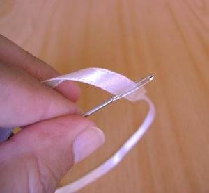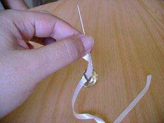 - Corte a fita e utilize a agulha de bordar para inseri-la nos chocalhos.
